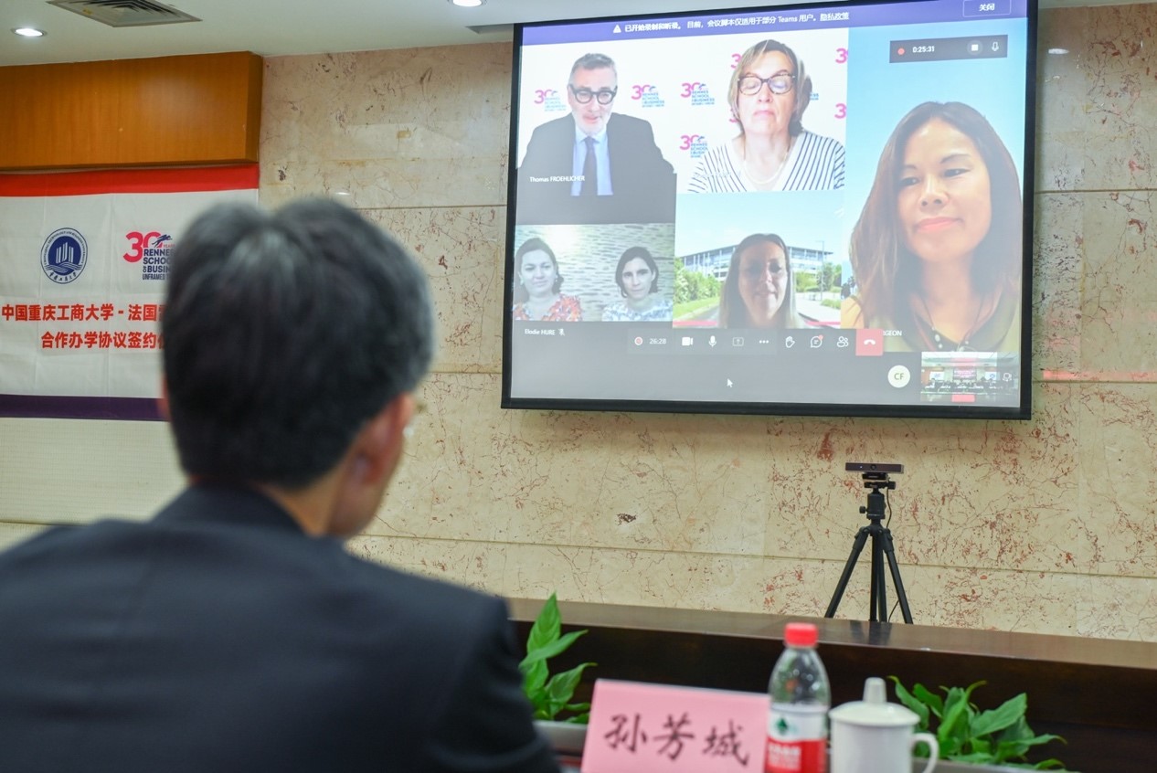 2022年6月18日下午,在学校隆重庆祝建校70周年期间,重庆工商大学和法国雷恩商学院合作协议签约仪式以视频方式在学校厚德楼3019会议室成功举行。仪式由学校国际处处长张轶主持。学校校长孙芳城、副校长柏群,国际处负责人、9428cn太阳集团古天乐班子全体成员及相关部门负责人,雷恩商学院校长Thomas FROEHLICHER、主管副校长和国际处负责人、项目负责人等,出席了签约仪式。