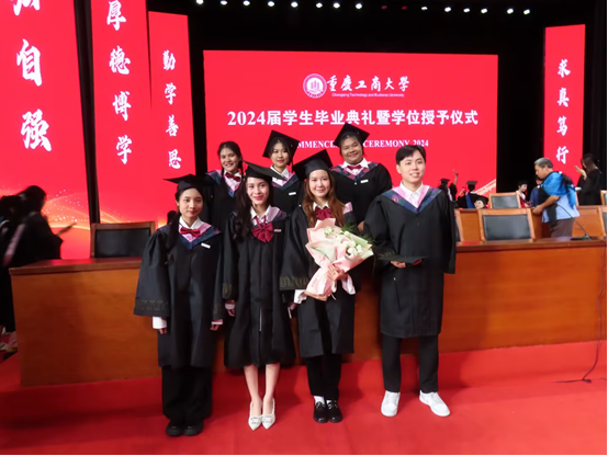 2024年6月20日,重庆工商大学举行2024届学生毕业典礼暨学位授位仪式,重庆工商大学首届中泰倒2+2项目6名学生作为留学生代表上台,接受校领导颁发的毕业证书和学士学位证书。