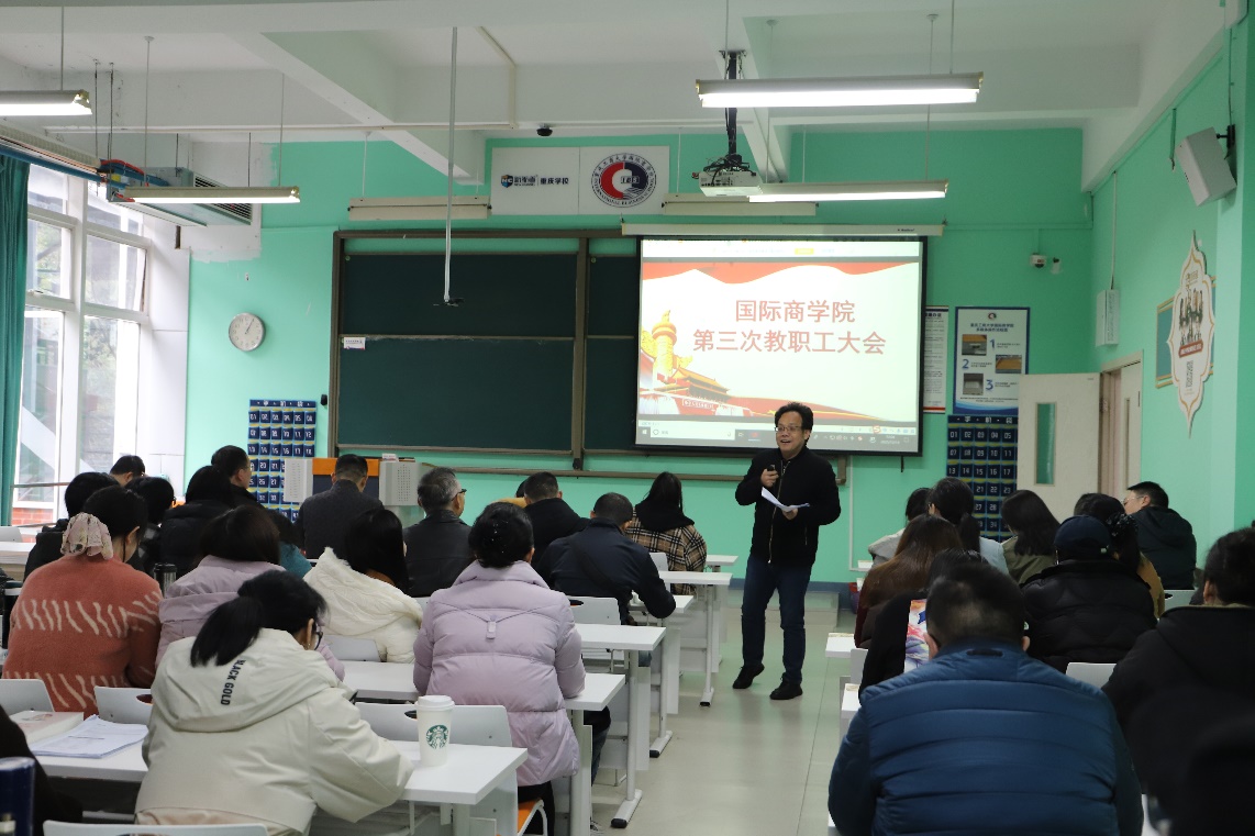 会议在庄严的国歌声中拉开帷幕。李大鹏同志首先致开幕词,他对学院教职工今年为学院发展所付出的辛勤努力表示衷心感谢,并强调了本次换届选举的重要意义。接下来,大会严格议程依次进行。首先,院长詹川作了2025年学院工作报告。报告从强化政治引领、深化国际合作、聚焦内涵建设、坚持以生为本等四个方面回顾了学院过去一年取得的显著成绩,并分析了学院当前发展存在的主要问题,明确了学院下一步发展方向。院长助理黎红作了2025年学院财务报告。蔡红明同志代表上一届工会作工会工作报告,报告指出,在学院党总支的正确领导下,工会积极发挥桥梁纽带作用,切实维护了教职工的合法权益。