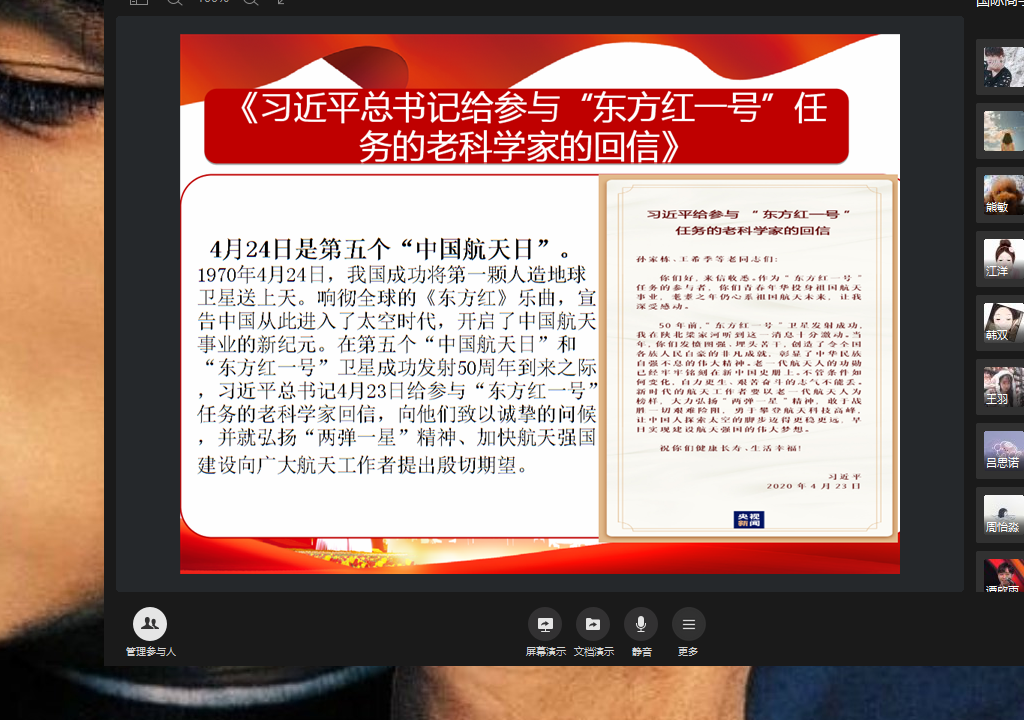 4月24日是第五个“中国航天日”。1970年4月24日,我国成功将第一颗人造地球卫星送上天。响彻全球的《东方红》乐曲,宣告中国从此进入了太空时代,开启了中国航天事业的新纪元。在第五个“中国航天日”和“东方红一号”卫星成功发射50周年到来之际,习近平总书记4月23日给参与“东方红