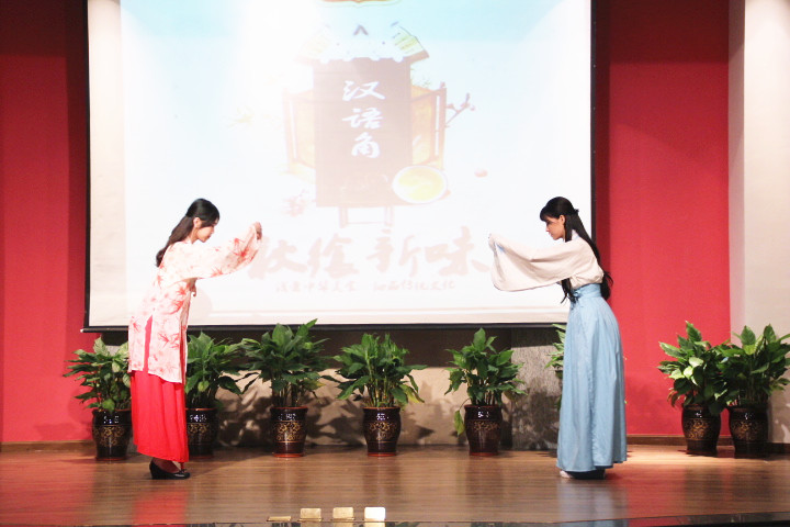 本次活动开场便有舞蹈掀起全场气氛,一开始苏川粤鲁四大菜系的介绍勾起的不仅仅是对佳肴的怀念,更含杂着人情的味道。紧接着的游戏环节,主持人邀请我院学生与留学生一起找出隐藏物品,不但有游戏乐趣还加深了中外友谊。谁是卧底的游戏不但说出了“馒头”和“饺子”的特征,还引得全场欢笑连连。在歌曲表演环节中,一曲《中国话》淋漓尽致的演绎引得全场拍手叫好,气氛再上一个高峰。接下来便是全场期待的汉服展示,国交部与礼仪队的同学们身着汉服,举止优雅,汉服不仅是中华服饰,更是传承几千年的情怀。在活动的最后,全场观众还品尝了春卷、驴打滚、咸鸭蛋、腊八粥等传统食物,让同学们加倍珍惜身在汉族文化的每一天。