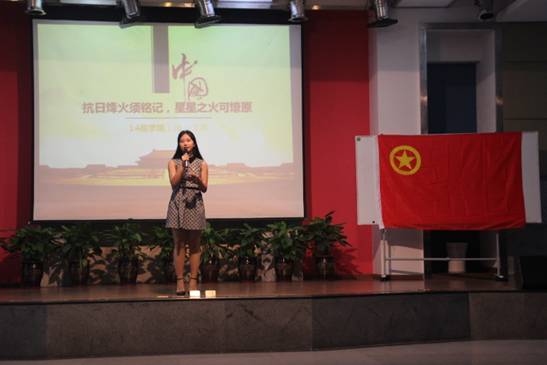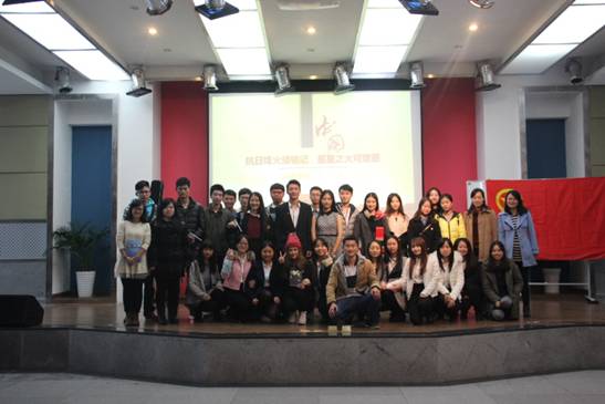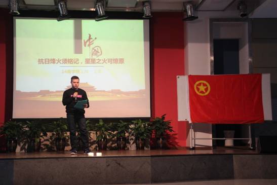 中午12:30,在二战名曲《雪绒花》的旋律中,活动正式开始。谭鹏同学首先带来《勿忘国耻》主题演讲,激昂澎湃的氛围震撼人心。随后,《星星之火》手舞配合格斗表演、留学生分享反法西斯的故事、抗日战争知识问答、小品《鬼子进村》、Show Time时刻、团体热舞《新时代》、游戏《你画我猜》等一系列环节加深了同学们的爱国主义情怀,以铭记抗日烽火,不忘先烈遗志。伴随着《强军战歌》的歌声,在浏览中国人民纪念抗战胜利70周年庆典图之后,本次活动圆满结束。活动后,老师同学们都对此次活动作出了高度评价。