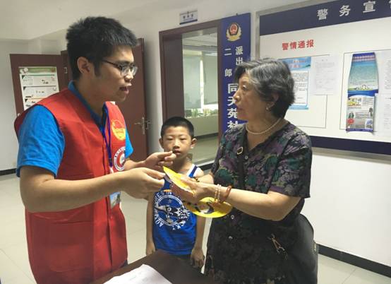 志愿者向社区居民讲解安全手环使用方法