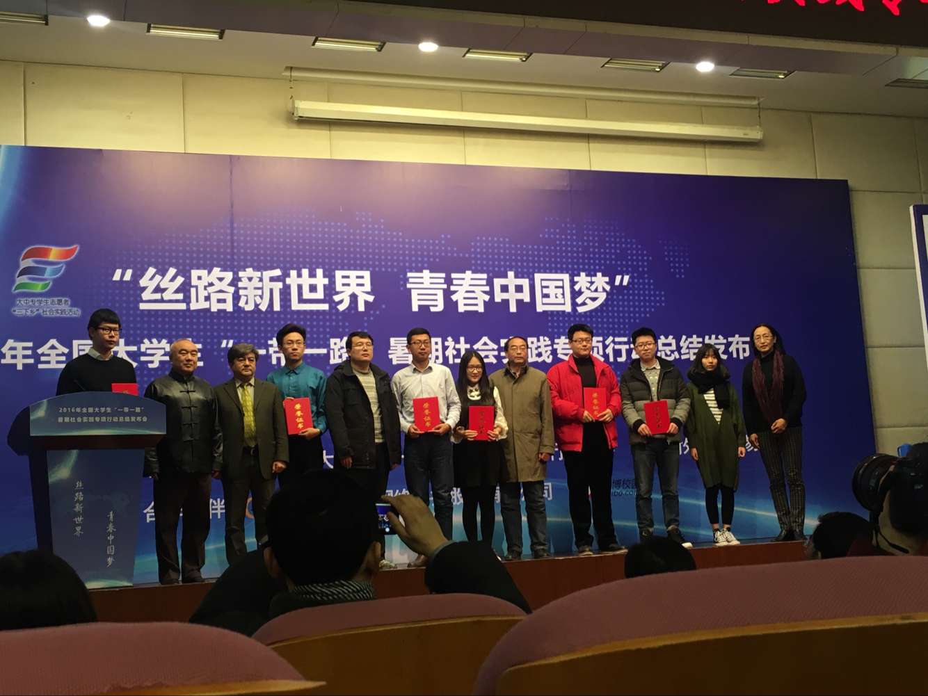 2016年11月24日,2016年全国大学生“一带一路”暑期社会实践专项行动总结发布会在对外经济贸易大学举行,团中央学校部副部长李骥、北京团市委领导和来自全国300余所高校师生代表参加了会议。9428cn太阳集团古天乐社会实践服务团荣获四项全国优秀荣誉,应邀参加此次发布会,并作为西南地区唯一优秀代表上台领奖。