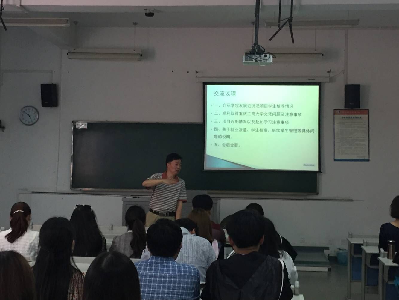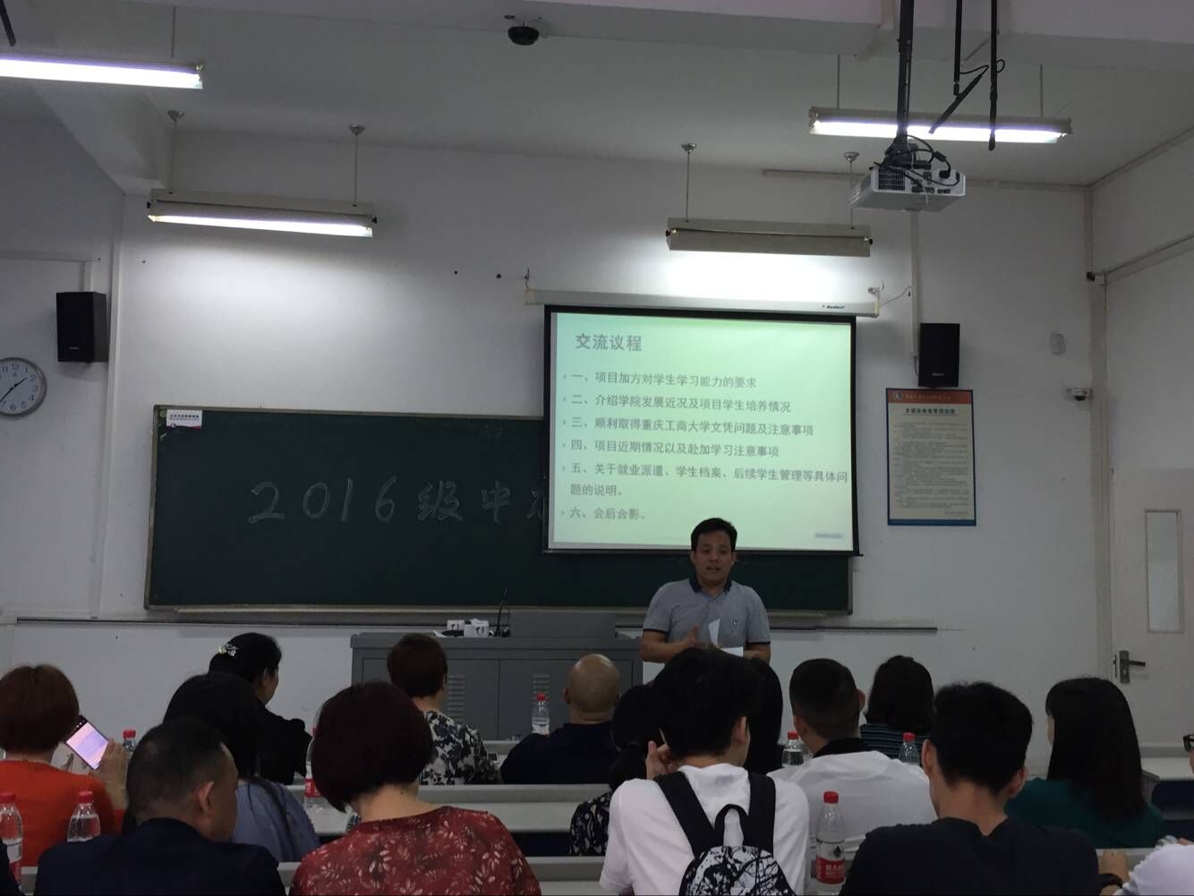 会议首先由李大鹏院长对参会家长表示热烈欢迎并对通过对方大学考试的同学表示祝贺,希望各位同学出国后继续努力取得更好的成绩。庞助理介绍学院发展近况并对学生提出殷切希望,苟部长和熊老师分别就学生归国取位及学生后续等工作向大家做了详细讲解。最后由陈昌盛副教授给学生介绍了对方学校的总体情况并和学生分享了对方学校学生生活等情况。