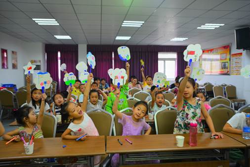 图为小朋友展示自己的作品