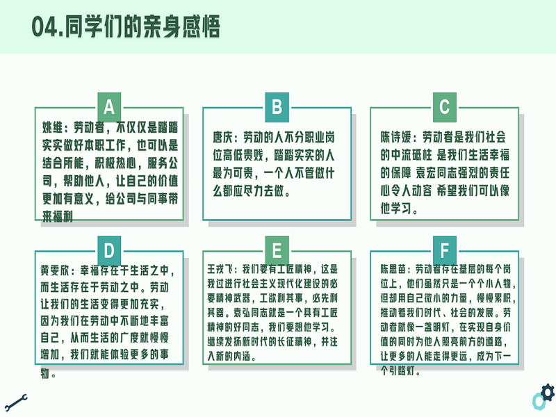 活动分享环节中,有同学指出,不管在什么年代,劳动者都是国家和社会的支柱。我们在这个社会上也一直是一个劳动者的角色,我们要时刻铭记身为劳动者而光荣,不管我们是为了生活也好、梦想也好,我们也一直在为社会做着我们所能做到的微弱的奉献。其他同学表示赞同,并添加了自己的感悟,汗水、付出、收获、荣耀,都是值得我们去记录和分享的,记录我们在生活中的所有劳动和奉献。在这次劳动节到来的同时,我们要为这一年所付出的努力而庆祝,为身为一个劳动者而庆祝。不管这一年里是否胜果累累,还是一无所获,我们都为我们的努力而自豪。