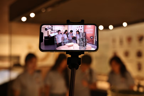 (实践团成员持设备直播逛馆 摄影 李祎喆)