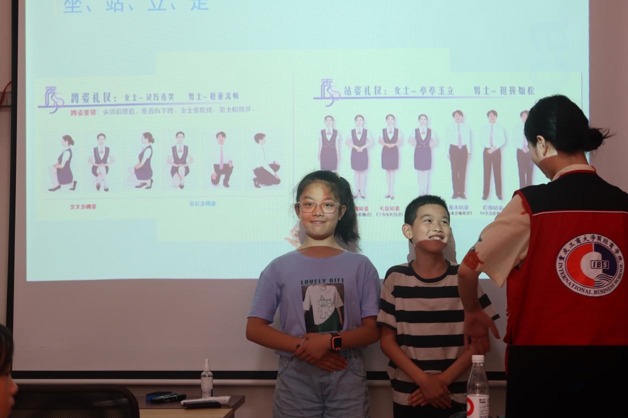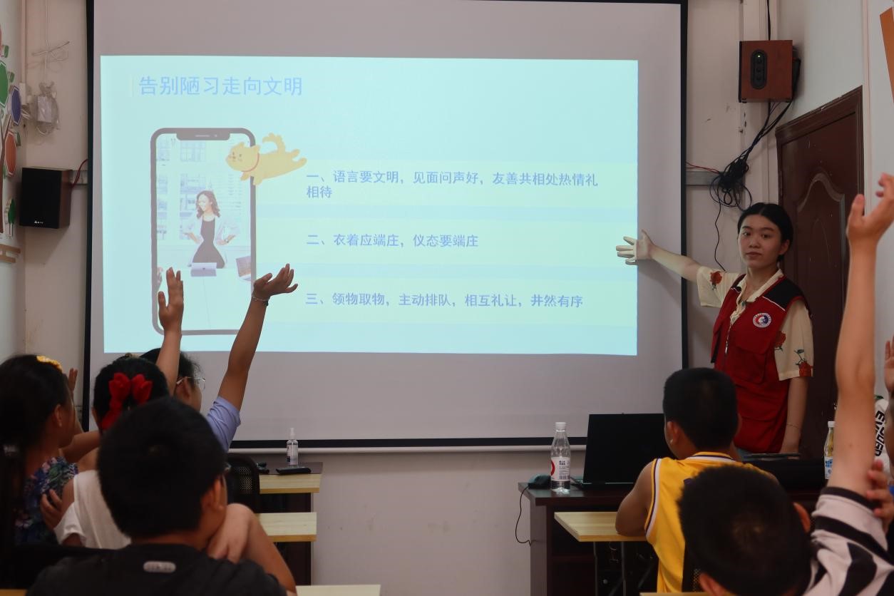 在活动过程中,志愿者夏星雨通过情景模拟小课堂带领小朋友初步认识了什么是文明礼仪、日常不文明行为有哪些,并引导青少年规范自身行为礼仪,让小孩子们讲文明、知礼仪。随后,志愿者为小朋友们进行了礼仪知识的系统讲解,对于仪容仪表、餐桌礼仪、乘车礼仪、见面礼仪等进行了标准示范。同时,志愿者通过趣味问答、画画等活动,寓教于学,让小朋友们在活动中充分展示自我,感悟中华礼仪文化,增强自身文明修养,促进青少年健康成长。