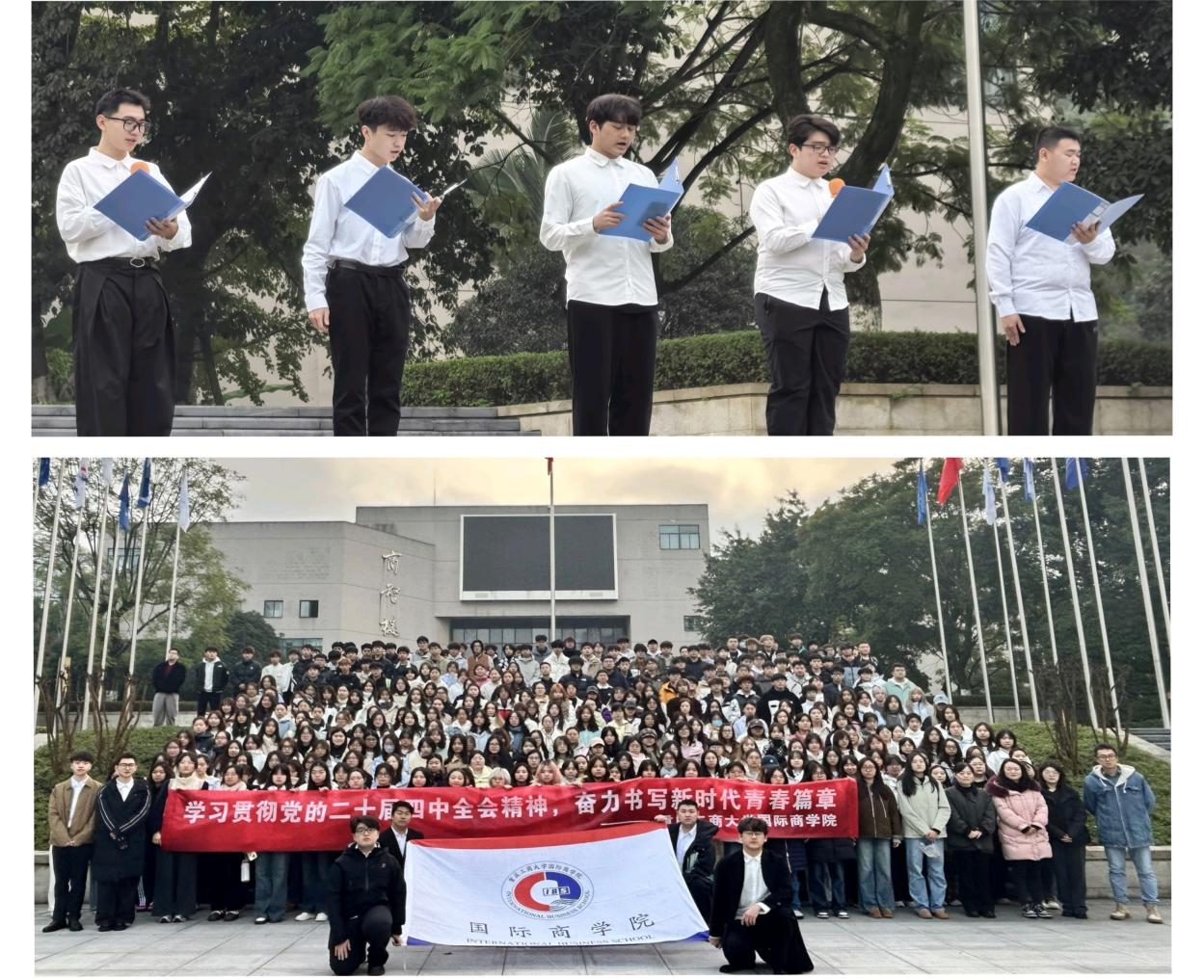 升旗仪式后,五位学生代表以激昂饱满的声韵献上主题朗诵。他们纵横千年,从丝路驼铃到“一带一路”的现代回响;贯通中西,自哲思诗情至5G量子的科技前沿。朗诵以“田野振兴”对位“国际赛场”,用“代码创新”呼应“文明交融”,层层递进地彰显了国商学子立足专业、胸怀天下的全球视野。誓言铿锵,展现了新时代青年将个人理想深度融入国家发展的坚定信念。朗诵在经久不息的掌声中落幕,全体师生合影留念,共同镌刻下这一凝聚使命与希望的珍贵时刻。