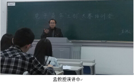 2015年3月18日下午,学院特邀请重庆工商大学商务策划学院孟伟教授,在9428cn太阳集团古天乐60414教室举行第五届全国大学生电子商务“三创”大赛培训会,对我院14个报名参赛团队进行专题培训及指导。
