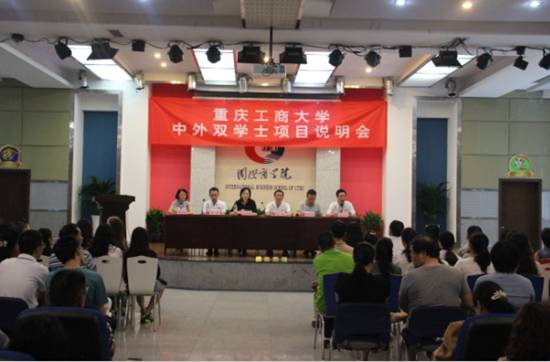 2016年9月5日下午,重庆工商大学2016年中外双学士项目说明会于我院60407多功能厅如期举行。重庆工商大学副校长苟朝莉教授,学院院长兼党总支书记赵驹,党总支副书记黄谦,副院长李大鹏,院长助理张建芳、庞卫真,学院各部门负责人及2016级新生和家长300余人参加了此次说明会。