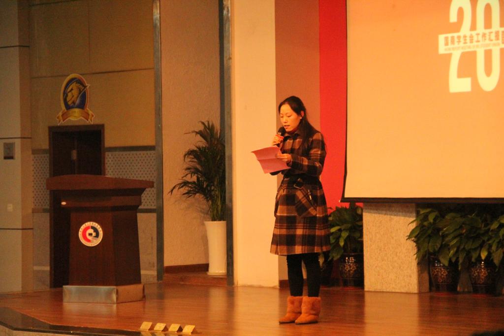 在主持人的开场白后,随着我院2016年获奖视频的播出,不仅让在场观众及到场嘉宾看到了国商一点一滴的变化,也拉开了此次大会的帷幕。首先,我院分团委书记苟焰老师致开幕词,她对学生会一年以来的工作予以高度赞扬以及肯定,同时希望学院的学生会工作继续努力、创新,力争再续辉煌,为国商争光,为工商蓄力。