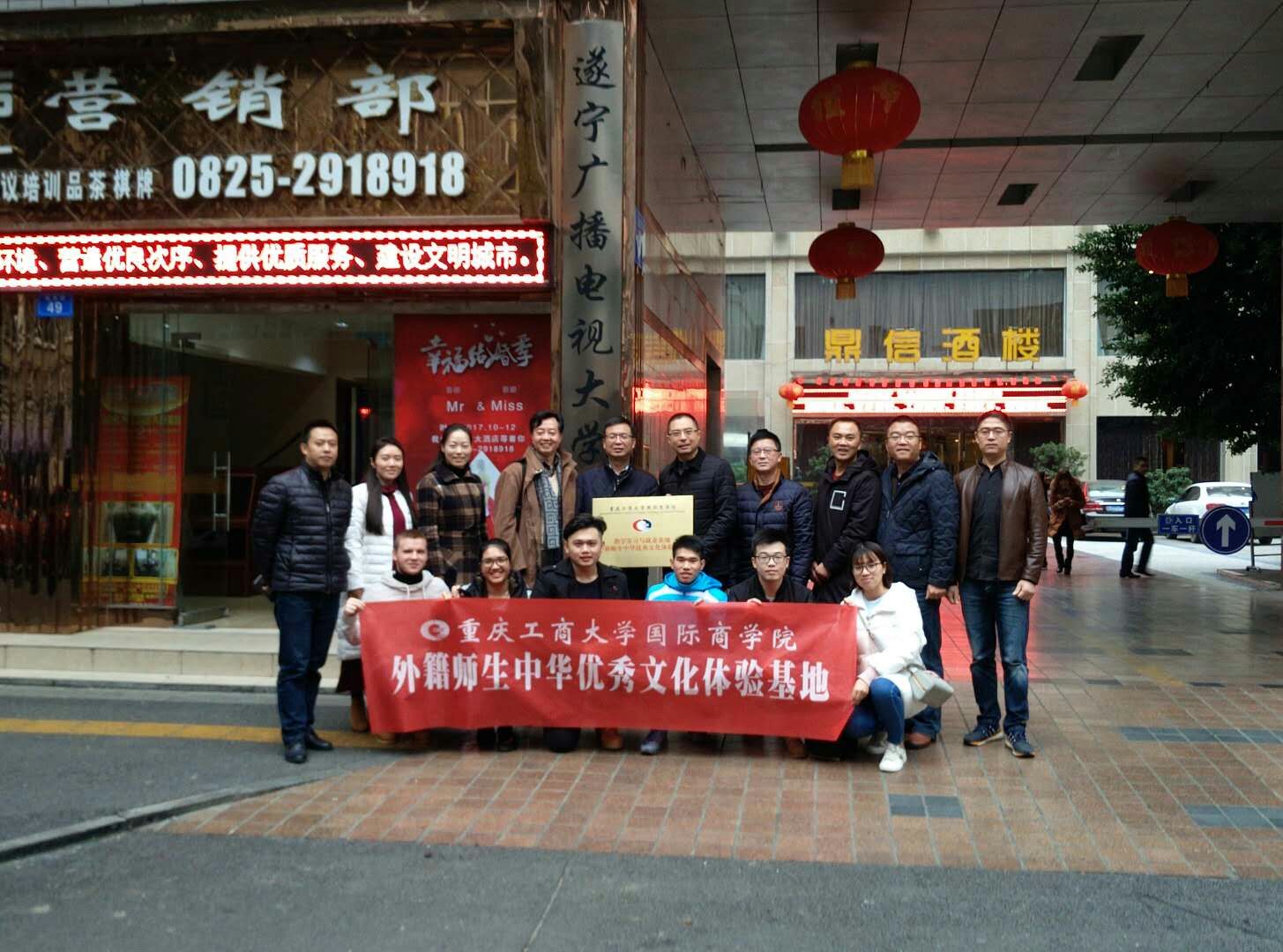 2017年12月7-8日,9428cn太阳集团古天乐与遂宁广播电视大学共建的“教学实习与就业基地”授牌仪式暨外籍师生中华优秀文化体验活动在遂宁成功举行。我院党总支书记兼院长赵驹、院长助理庞卫真、院办公室主任杨波、教学部部长苟焰及来自越南、马来西亚、哈萨克斯坦等国4名留学生以及2名国内学生干部参加了本次活动。
