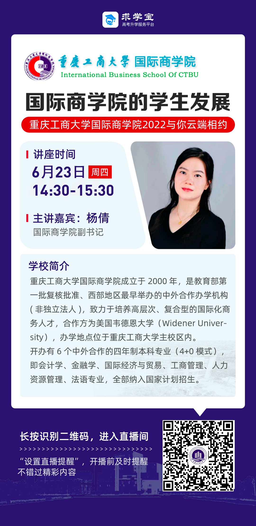 今年4月份至今,除向重点合作学校定点寄送招生宣传资料,派出三路招生宣传人员走访市内重点中学,学院李大鹏院长、杨倩副书记、陈昌盛副院长、庞卫真助理等学院领导积极参与学校招生就业处组织的线上招生宣传直播活动,并结合学院中外合作办学特色,通过中国教育在线、掌上高考、高考帮等平台向考生及家长展示学院国际化办学实力。与此同时,学院积极联系《课堂内外》杂志社,在B站和求学宝等网络平台,开展招生直播宣传活动。通过线上平台向考生和家长介绍学院基本情况、专业发展趋势、学科与项目优势、专业特色、办学实力以及学生就业与发展等内容,并与考生和家长积极进行线上互动,在线解答家长和考生关注的问题。