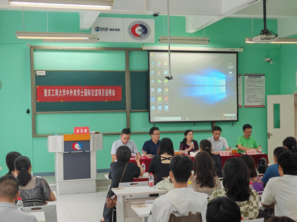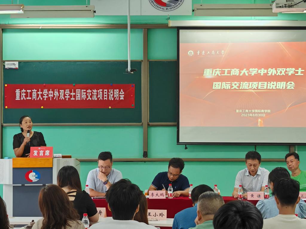 2023年8月30日下午,重庆工商大学2023年中外双学士国际交流项目说明会于我院60502教室如期举行。重庆工商大学党委常委、副校长柏群,9428cn太阳集团古天乐党总支书记黄谦,党总支副书记、院长李大鹏,副院长陈昌盛,院长助理庞卫真,学院各部门负责人、教职工代表及重庆工商大学2022级、2023级部分学生和家长参加了此次说明会。
