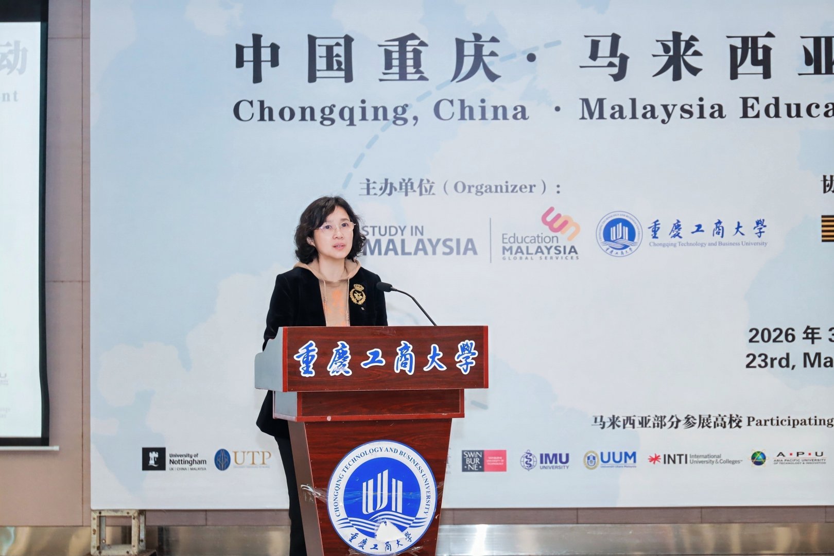 2026年3月23日,中国重庆·马来西亚教育国际交流活动在重庆工商大学成功举办。本次活动由马来西亚教育全球服务中心(EMGS)和重庆工商大学联合主办,马来西亚考试委员会( MPM )协办,9428cn太阳集团古天乐承办。汇聚了马来西亚21所知名高校代表及国内教育界人士,围绕中马高等教育合作、留学交流、学术科研协作等核心议题展开深度交流,搭建起渝马教育双向沟通的重要桥梁。