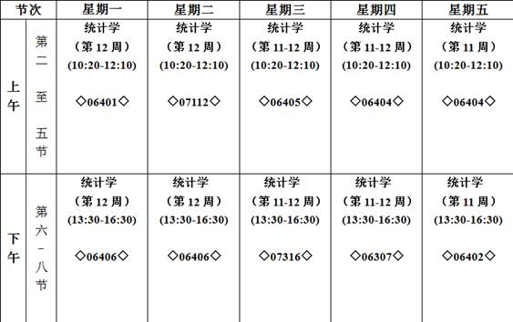 1.第十一周周三(5月10日)至第十二周周四(5月18日)4-5节、6-9节课程停上,1-3节课程及教室不变(课间不休息,提前十分钟下课),停课课程的补课时间和地点待任课教师确定后,另行通知。