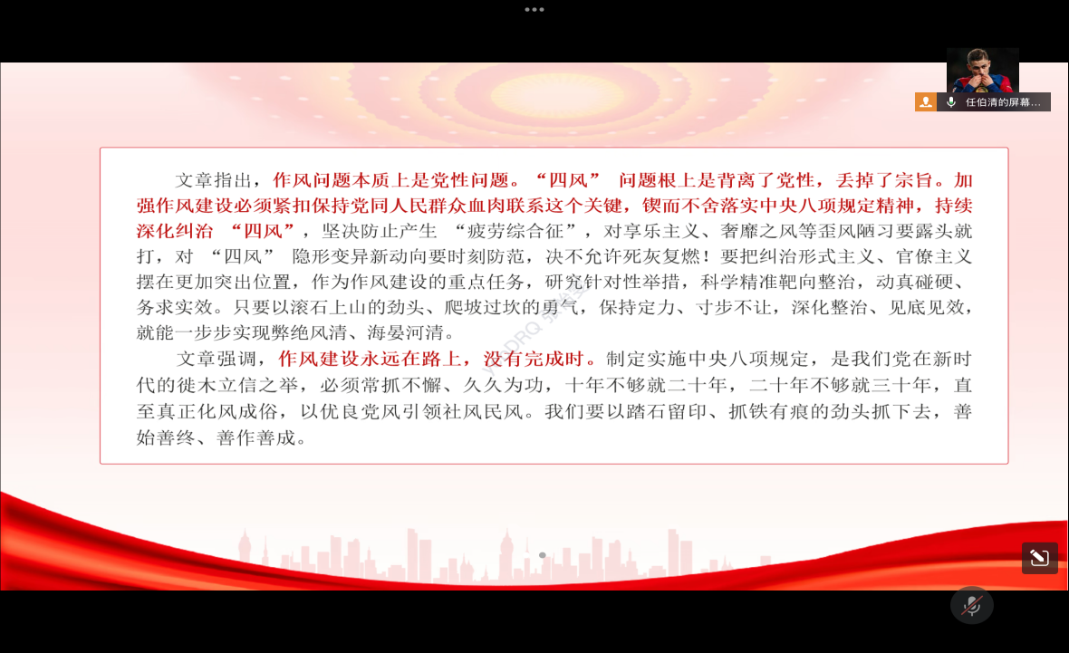 任伯清同志领学了习近平总书记在第三十五个全国助残日到来之际作出的重要指示精神、中共中央国务院印发的《党政机关厉行节约反对浪费条例》、习近平总书记对“十五五”规划编制工作作出的重要指示精神、习近平总书记对精神文明建设工作作出的重要指示精神、中央八项规定及其实施细则精神、《八项规定改变中国》、先进人物事迹。