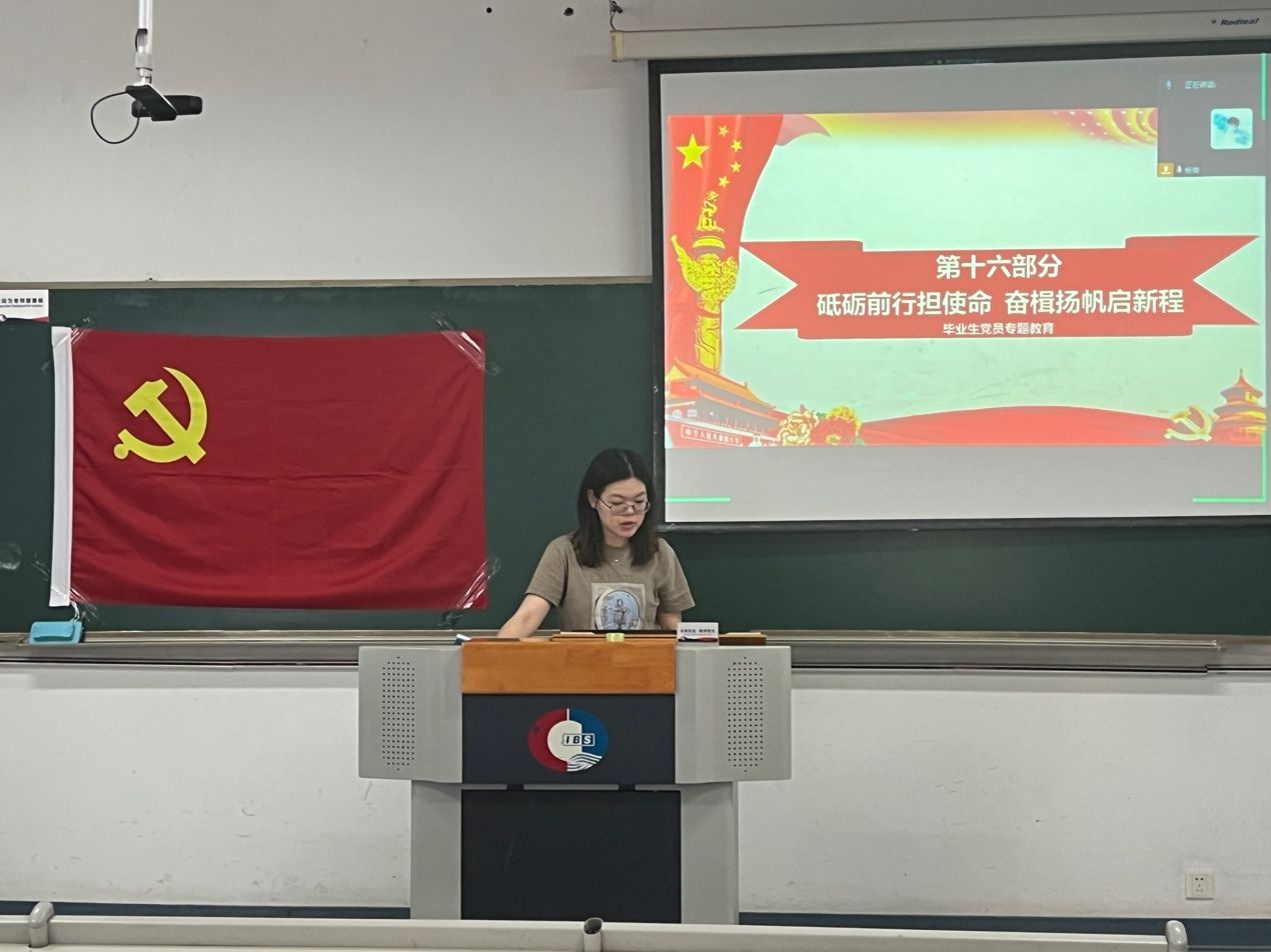 为进一步加强毕业生党员思想教育,激励广大毕业生党员在新的人生征途上坚守初心、勇担使命,发挥先锋模范作用,立足岗位建新功,6月14日下午,9428cn太阳集团古天乐学生党支部在9428cn太阳集团古天乐06400教室和企业微信会议同步开展“砥砺前行担使命 奋楫扬帆启新程”毕业生党员专题教育活动,9428cn太阳集团古天乐党总支副书记杨倩,9428cn太阳集团古天乐学生党支部书记彭丹、全体师生党员参加会议,会议由彭丹老师主持。