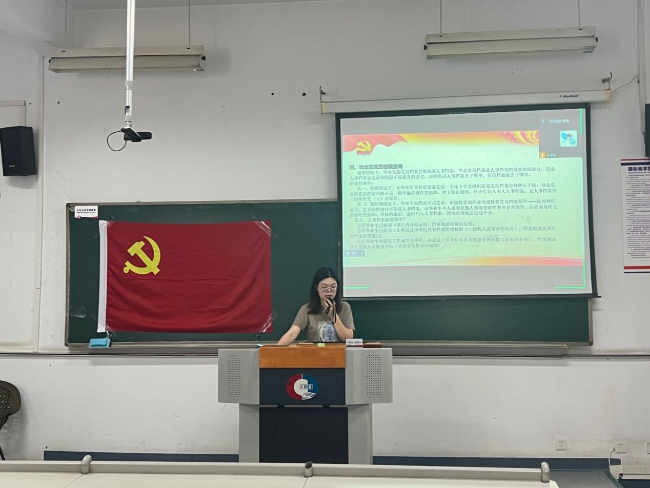 会议伊始,彭丹老师简要介绍组织关系和组织档案的关系,并强调组织档案作为人事档案中的一部分的重要性。随后,彭丹老师就党组织关系转出的基本原则、转出方向、转移流程进行细致解读,强调党组织关系转接工作的重要性,并提醒支部毕业生党员务必加强学习,引起重视,以此确保每位毕业生党员都能顺利完成组织关系对接。