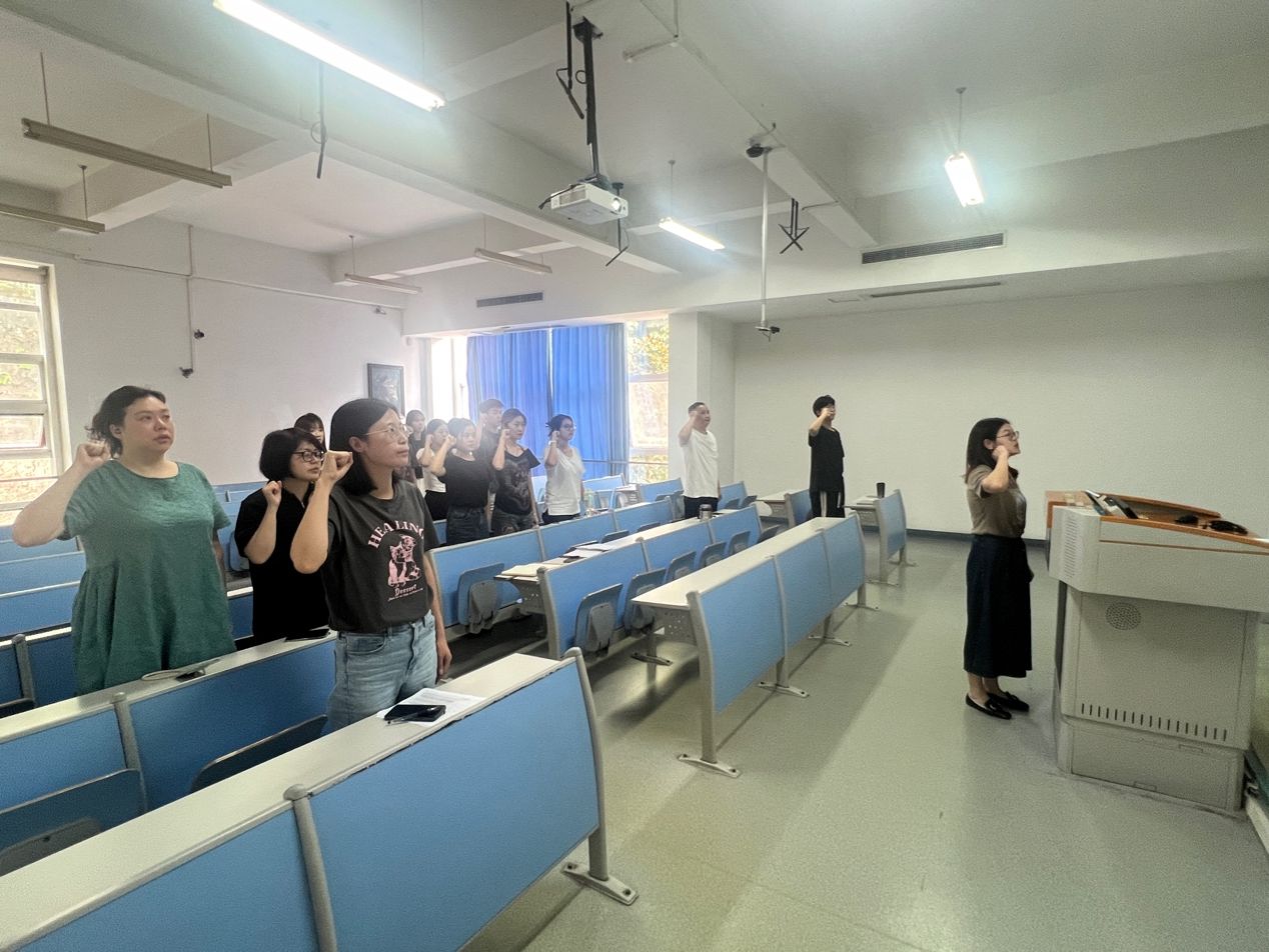 最后,彭丹老师带领全体支部同志在党旗下庄严地重温入党誓词,以此警醒党员要时刻强化身份意识,做到肩上有担,心中有责,以实际行动践行初心和使命。
