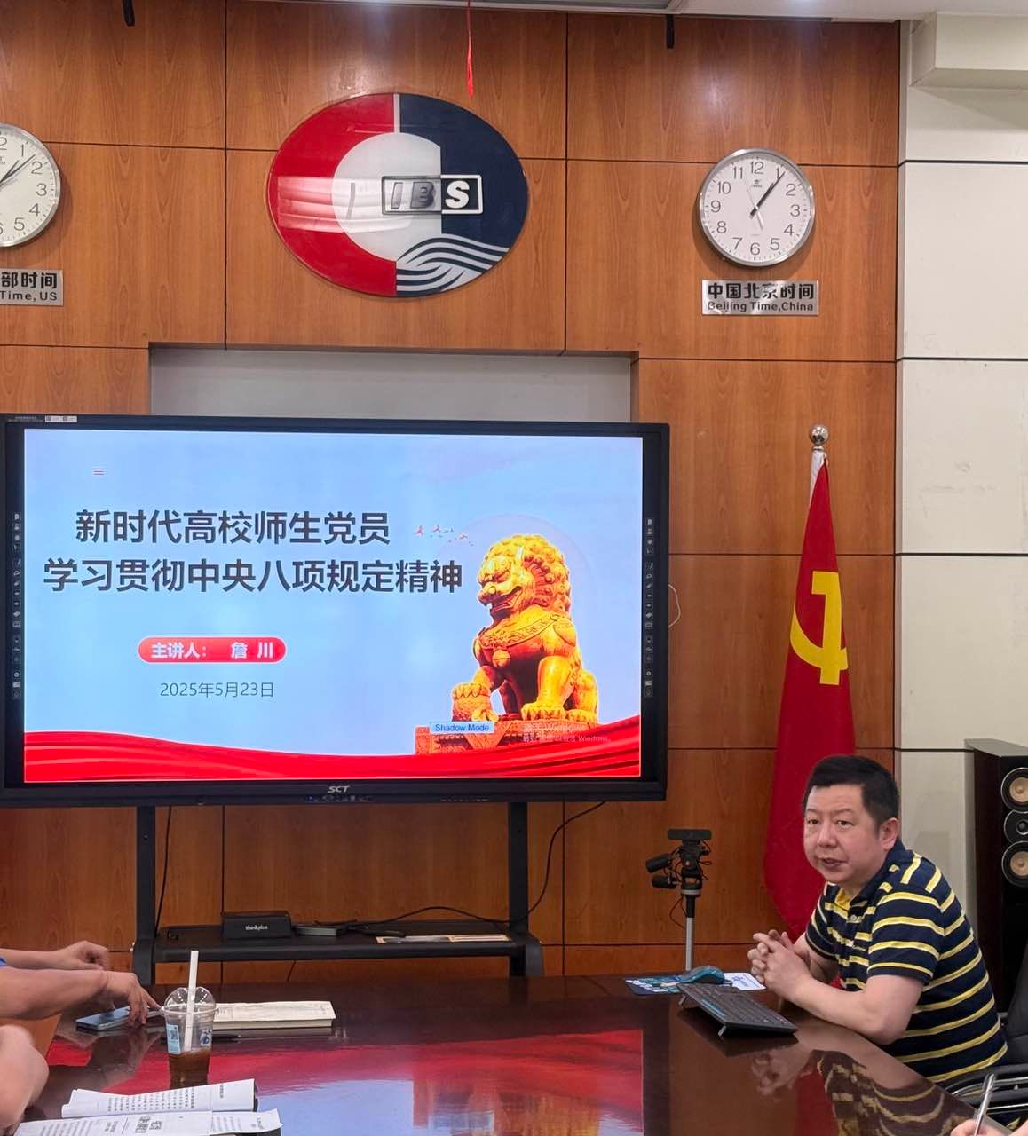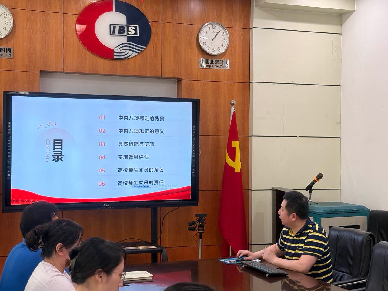 首先,学院党总支副书记、院长詹川为支部党员讲授了“新时代高校师生党员学习贯彻中央八项规定精神”的专题党课。詹书记从中央八项规定的出台背景和重要意义切入,系统解读了具体措施与实施要求,并结合实际案例分析了实施以来所取得的显著成效。詹书记特别强调,作为高校师生党员,要深刻认识自身在作风建设中的角色与责任,始终以更高标准要求自己,将八项规定精神融入教学、科研和管理工作,共同营造风清气正的育人环境。